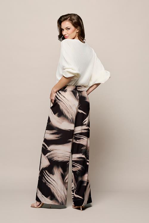Zwart-witte wijde broek met grafische printDe Aiden broek in zwart-wit is een stijlvolle en comfortabele wide leg broek met een opvallende grafische print. Het model is aangesloten bij de heup en l…