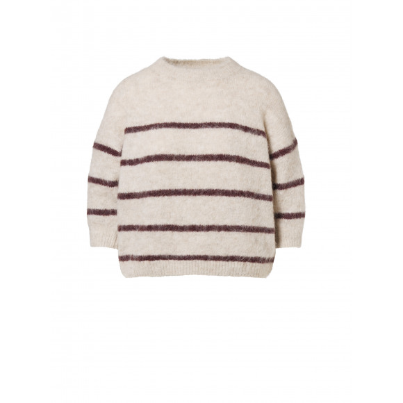 Trui van het merk Beaumont. Deze zachte, gebreide trui in een warme beige tint is verrijkt met horizontale strepen in een diepe bordeauxkleur voor een tijdloze, maar toch eigentijdse uitstraling. De relaxte pasvorm en het subtiel opstaande boordje maken hem perfect voor zowel casual als geklede looks.