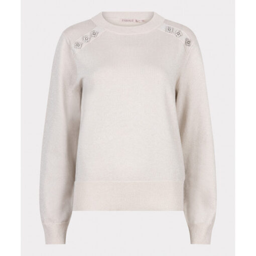 Trui van het merk Esqualo. Deze prachtige fijngebreide trui in een zachte beige tint is verrijkt met subtiel glanzend lurex voor een luxe uitstraling. De blikvanger zit op de schouders: schitterende sierknopen bezet met fonkelende steentjes, die zorgen voor een elegante en feestelijke touch. Dankzij de ronde hals en comfortabele pasvorm is deze trui perfect te dragen op een mooie pantalon of rok, maar ook casual op een jeans.