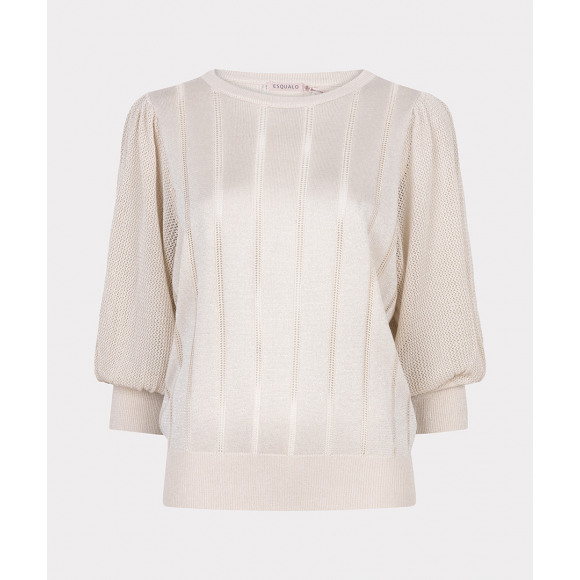 Trui van het merk Esqualo. Deze elegante, lichtbeige trui is uitgevoerd in een fijngebreide structuur met subtiele verticale strepen, wat zorgt voor een verfijnde uitstraling. De driekwart pofmouwen met een luchtige, opengewerkte knit geven het model een speels en modern effect. De zachte stof biedt een comfortabele pasvorm, perfect voor zowel casual als geklede gelegenheden.