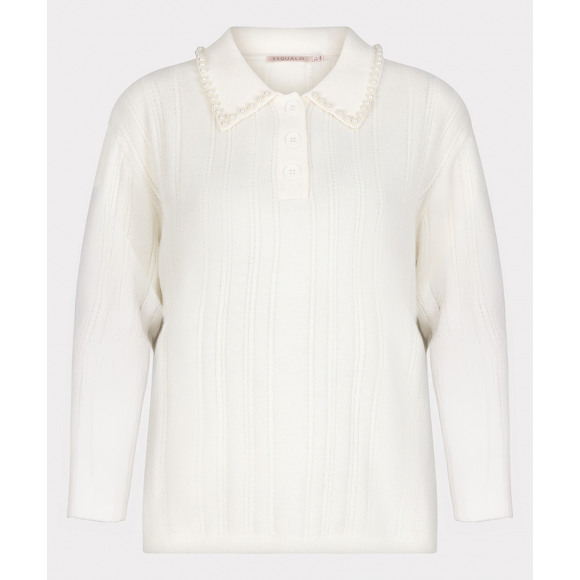Trui van het merk Esqualo. Deze elegante fijngebreide trui in een frisse witte tint is uitgevoerd met een klassiek polokraagje dat prachtig is afgewerkt met pareldetails voor een vrouwelijke en luxe uitstraling. De subtiele verticale structuur in de stof geeft het geheel een verfijnde touch, terwijl de knoopsluiting aan de hals zorgt voor een stijlvolle, tijdloze look.