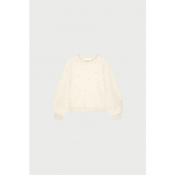 Sweater van het merk Fabienne Chapot. Deze grijze trui met geborduurde hartjes is een vrolijke toevoeging aan je garderobe. Het model heeft een ronde hals, verlaagde schoudernaden en ballonmouwen met brede boorden voor een speelse, vrouwelijke look. Gemaakt van een zachte katoenmix die heerlijk comfortabel draagt. De trui is er ook in een offwhite variant.