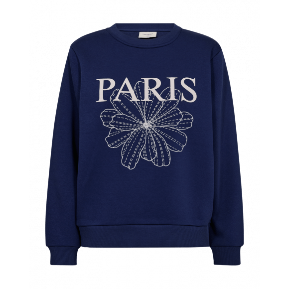 Sweater van Freequent. Deze donkerblauwe sweater is een casual en trendy item met een opvallende print. Op de voorkant staat in grote letters ‘PARIS’, gecombineerd met een moderne bloemenprint in contrasterend wit. De sweater heeft een relaxte pasvorm en is afgewerkt met ribboorden aan de hals, mouwen en zoom. Perfect voor een comfortabele, maar stijlvolle look.