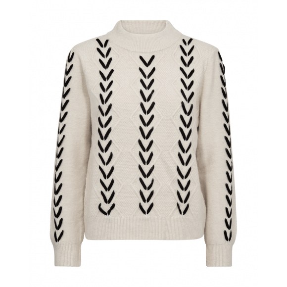 Pullover van Freequent. Deze zachte trui in de kleur Moonbeam met zwarte details is een echte eyecatcher. Het breisel heeft een subtiel ruitpatroon waarin een contrasterend zwart vlechtmotief is verwerkt, wat de trui een speelse maar toch stijlvolle uitstraling geeft. De colkraag en geribde boorden zorgen voor extra comfort en een mooie pasvorm.