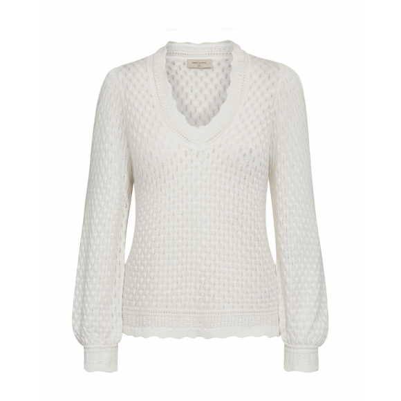Ajour gebreid truitje van het merk Freequent. Een heel leuk truitje met v-hals en lange pofmouw. Je kan hem super dragen onder een blazer of gilet, maar natuurlijk ook gewoon als los basis item op bijvoorbeeld een pantalon of jeans.