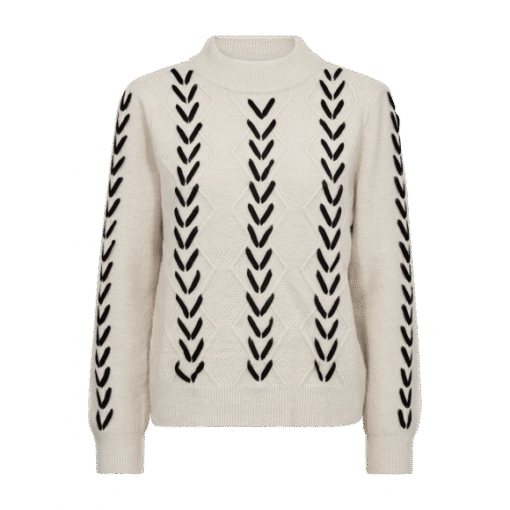 Pullover van Freequent. Deze zachte trui in de kleur Moonbeam met zwarte details is een echte eyecatcher. Het breisel heeft een subtiel ruitpatroon waarin een contrasterend zwart vlechtmotief is verwerkt, wat de trui een speelse maar toch stijlvolle uitstraling geeft. De colkraag en geribde boorden zorgen voor extra comfort en een mooie pasvorm.