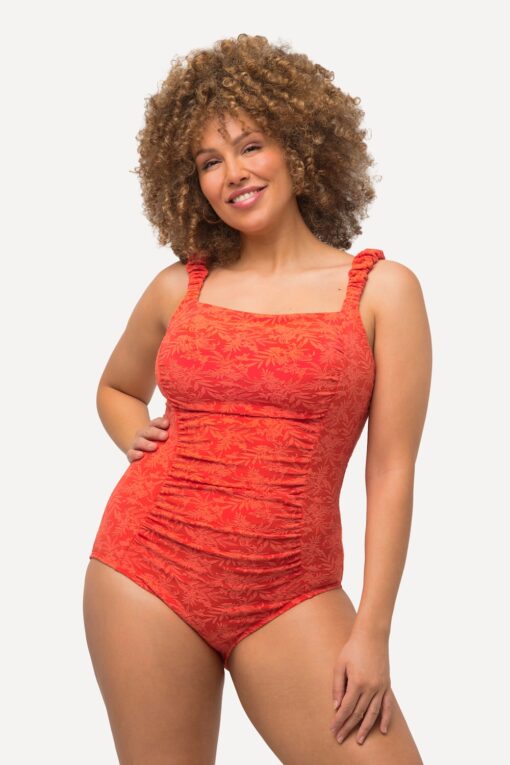 Badpak met softcups en decoratief jacquard bloemendessin. Modieuze ruchesbandjes, aangerimpelde siernaden. Steunende band onder de buste, voering voor. OEKO-TEX.