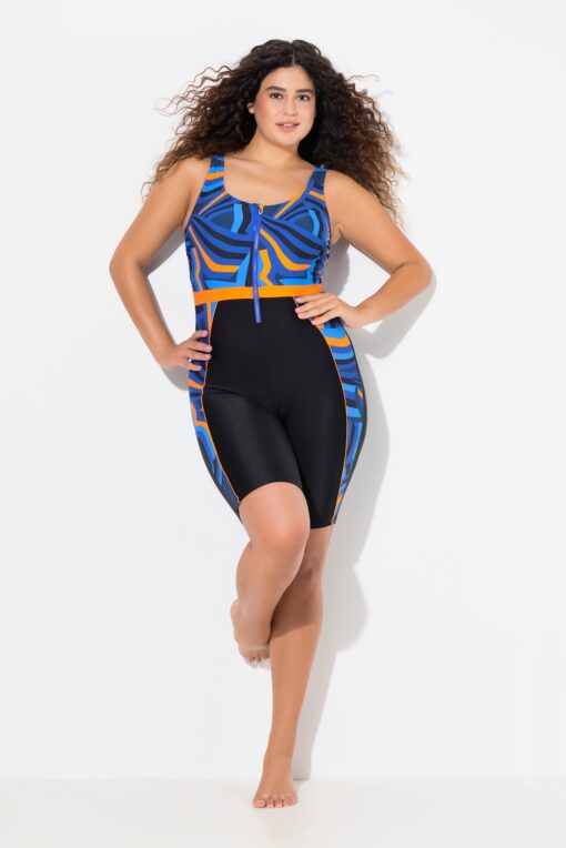 Badeanzug ohne Softschalen, mit langem Bein. Büste mit Wellenmuster, Rundhalsausschnitt mit Reißverschluss. Unterbrustband, Vorderfutter. Hergestellt mit recyceltem Polyamid, OEKO-TEX.