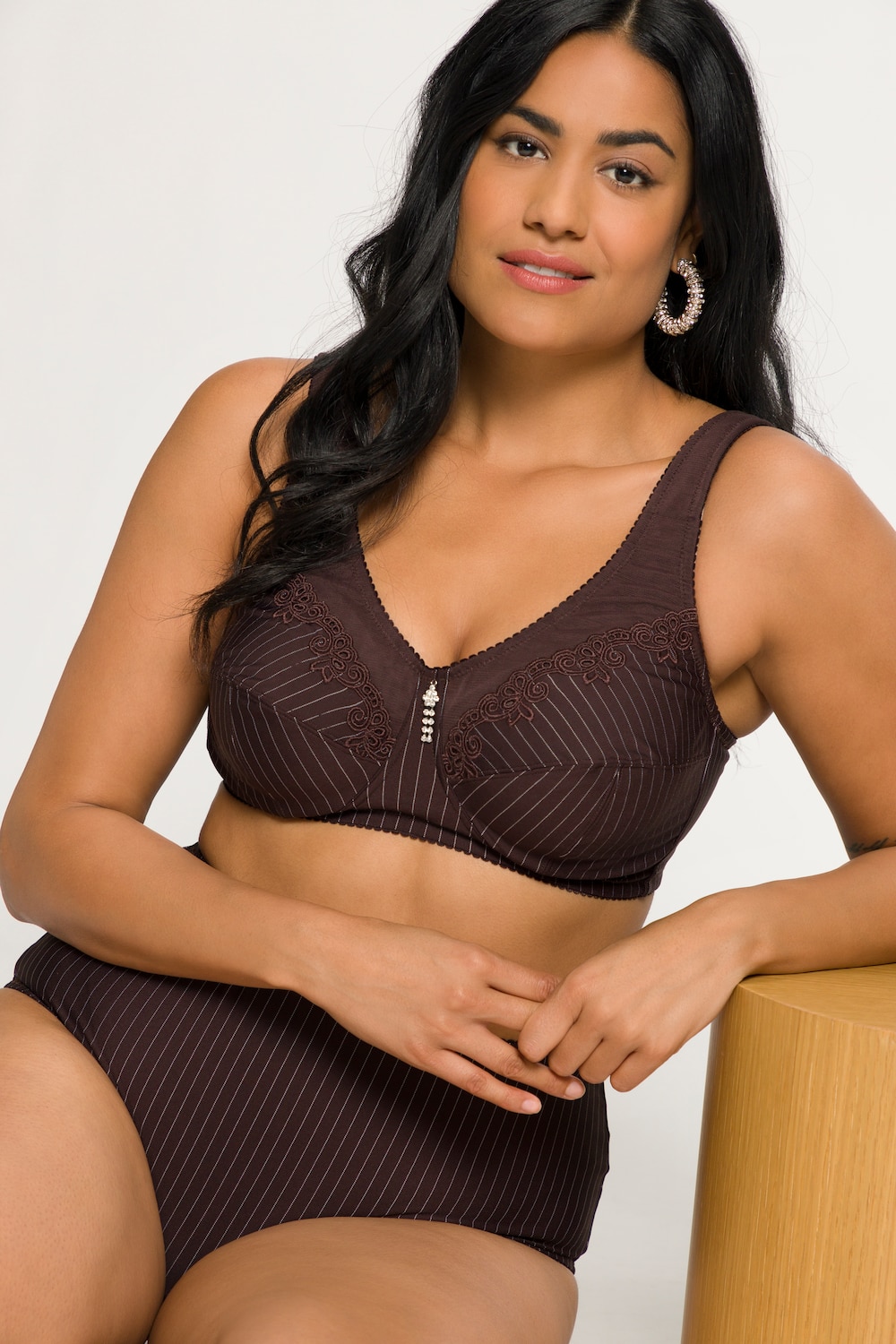 Deze comfortbeha met klassiek krijtstreepdessin geeft veilige steun voor grote maten en is daardoor een betrouwbare partner. De extra brede, gepolsterde, in lengte verstelbare bandjes en het hogere rugdeel voorkomen het snijden in de huid. Daardoor zit de beha aangenaam en beschermt zo de rug en schouders. De band onder de buste, de ingewerkte inzetten van netstof opzij en onder de bandjes zorgen voor goede steun en passen zich optimaal aan het lichaam aan. Een extra sikkelvormige inzet in de cup ondersteunt en pusht licht de buste.