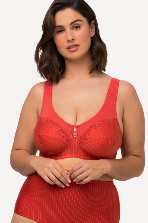 Deze comfortbeha met klassiek krijtstreepdessin geeft veilige steun voor grote maten en is daardoor een betrouwbare partner. De extra brede, gepolsterde, in lengte verstelbare bandjes en het hogere rugdeel voorkomen het snijden in de huid. Daardoor zit de beha aangenaam en beschermt zo de rug en schouders. De band onder de buste, de ingewerkte inzetten van netstof opzij en onder de bandjes zorgen voor goede steun en passen zich optimaal aan het lichaam aan. Een extra sikkelvormige inzet in de cup ondersteunt en pusht licht de buste.