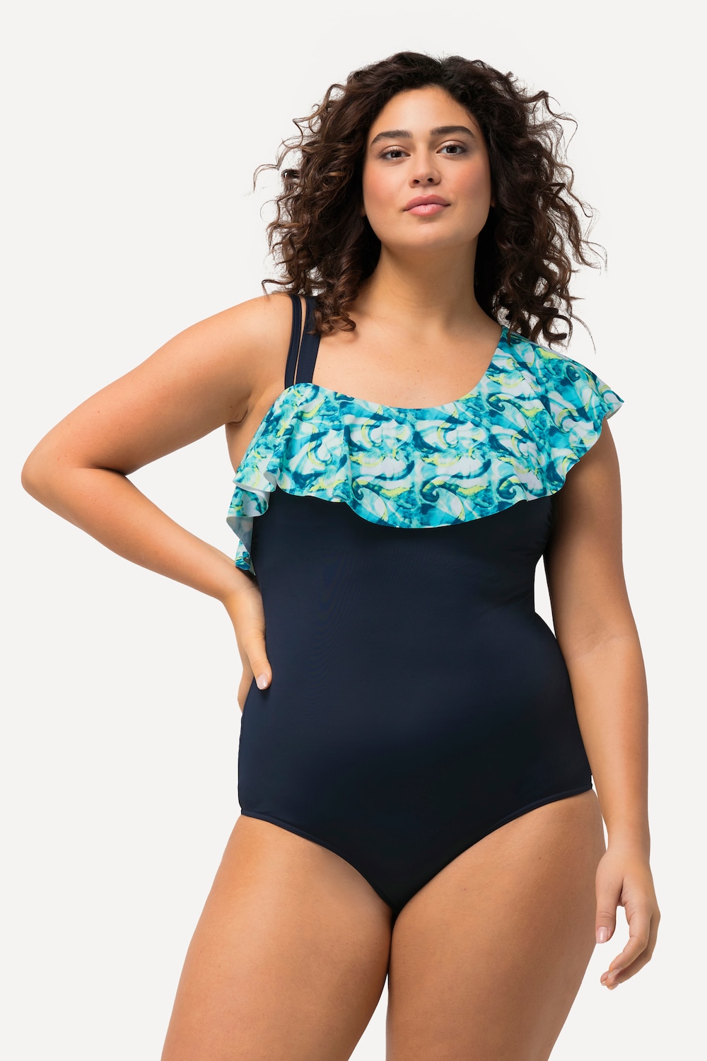 Grote Maten One shoulder-badpak, Dames, blauw, Maat: 58, Synthetische vezels/Elastaan, Ulla Popken
