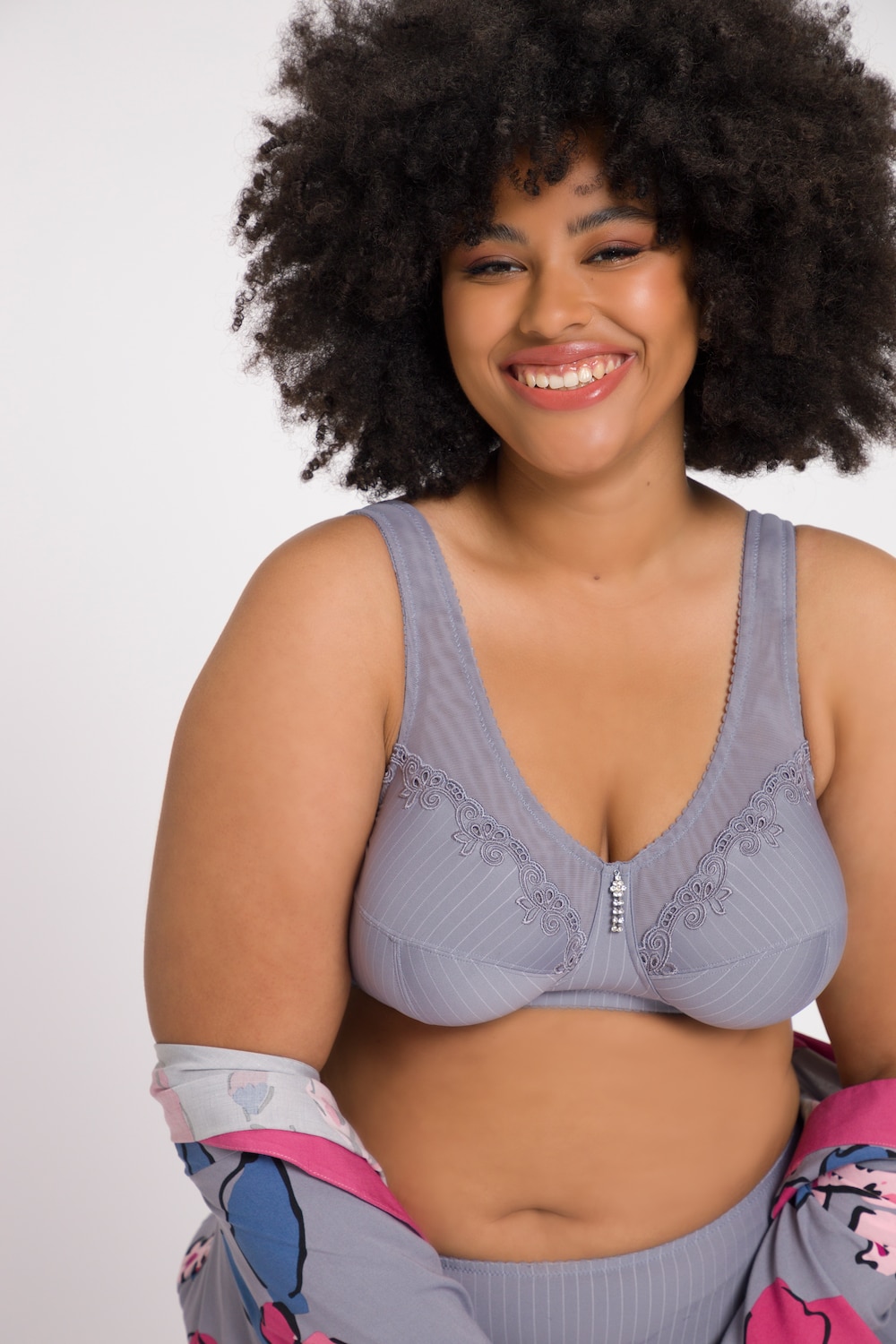 Deze comfortbeha met klassiek krijtstreepdessin geeft veilige steun voor grote maten en is daardoor een betrouwbare partner. De extra brede, gepolsterde, in lengte verstelbare bandjes en het hogere rugdeel voorkomen het snijden in de huid. Daardoor zit de beha aangenaam en beschermt zo de rug en schouders. De band onder de buste, de ingewerkte inzetten van netstof opzij en onder de bandjes zorgen voor goede steun en passen zich optimaal aan het lichaam aan. Een extra sikkelvormige inzet in de cup ondersteunt en pusht licht de buste.