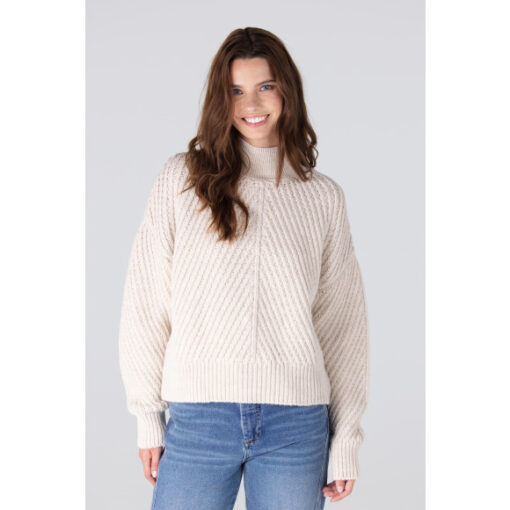 Trui van Jansen Amsterdam. Deze zachte gebreide trui in een warme beige tint is een echte musthave voor het najaar. De diagonale ribstructuur geeft een modern en speels effect, terwijl de hoge hals en brede boorden zorgen voor extra comfort en een stijlvolle uitstraling. Een tijdloze knit die moeiteloos combineert met al je favoriete items.
