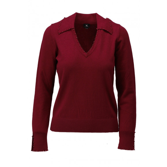 Trui van het merk K-Design. Deze trui heeft een V-hals met kraag, afgewerkt met subtiele kraaltjes voor een chique detail. Ook de manchetten zijn voorzien van kraaltjes en de ribboorden langs de zoom en mouwen zorgen voor een mooie pasvorm.