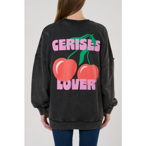 Sweater van het merk Le Temps des Cerises. Deze zwarte sweater met een vintage wassing heeft een relaxte, oversized pasvorm en verlaagde schoudernaden voor een nonchalante look. Op de borst en de achterkant prijkt een vrolijke, felgekleurde print met kersen en de tekst Cerises Lover in roze letters. Gemaakt van een zachte, comfortabele katoenmix die heerlijk draagt.