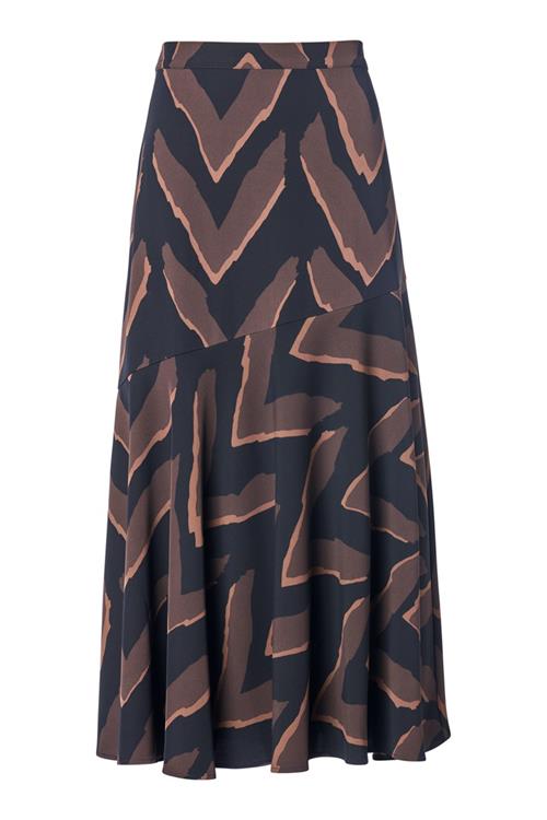 Donkerbruine rok met abstracte printDonkerbruin is de kleur van het nieuwe modeseizoen! De Mayce print rok heeft een prachtig abstract zigzagdessin. Het warme kleurenpalet van het dessin bestaat ui…