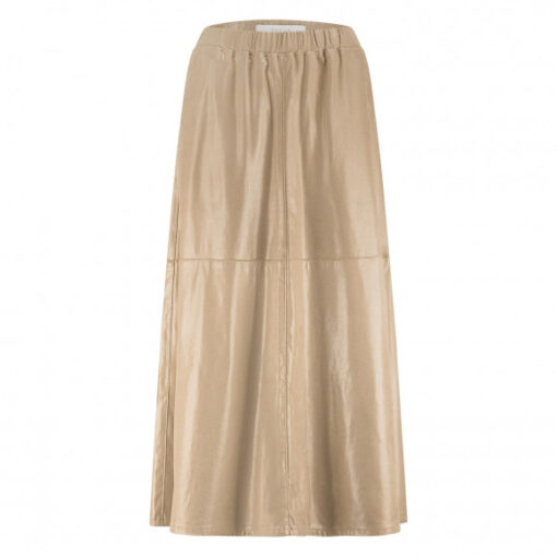 Rok van het merk Nukus. Deze midi-rok is uitgevoerd in een zachte suedine-look met glanzende coating aan de bovenkant. Het model heeft een elastische tailleband en steekzakken, en valt soepel langs het lichaam.