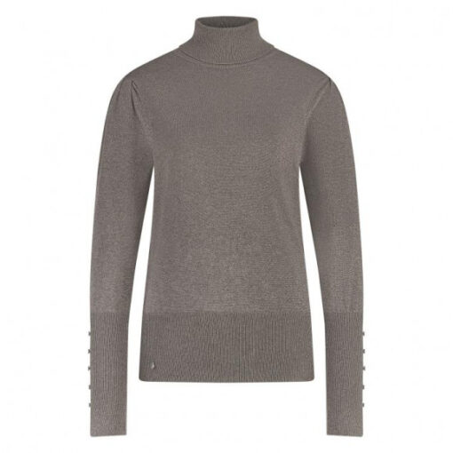 Trui van Nukus. Deze taupekleurige trui met subtiele glans is een elegante toevoeging aan je garderobe. De hoge col en de rechte pasvorm zorgen voor een moderne en comfortabele uitstraling. Een stijlvol detail zijn de knoopjes langs de mouwen, die de trui een verfijnde twist geven.
