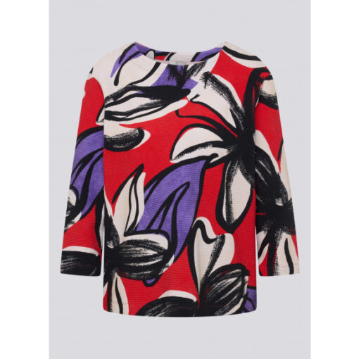 Sweater van het merk Rabe. Deze stijlvolle sweater met 3/4 mouwen heeft een expressieve bloemenprint in rood, zwart, wit en paars, wat zorgt voor een levendige en modieuze uitstraling. De ronde hals en de comfortabele, licht losvallende pasvorm maken dit item ideaal voor zowel casual als geklede combinaties. De zachte, licht gestructureerde stof voelt prettig aan op de huid en geeft de top net dat beetje extra.
