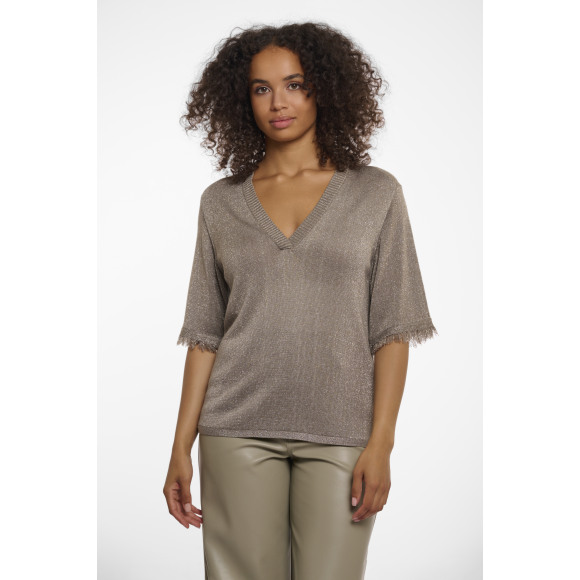 Fijn gebreid truitje met lurex glitter draadje van het merk Rino & Pelle. Dit truitje valt soepel, heeft een v-halsje en een rafeltje aan de korte mouw.