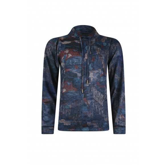 Top van Roberto Sarto. Deze top heeft een speels allover dessin in blauwtinten met subtiele rode accenten. Het model is voorzien van een opstaande kraag met koordsluiting, wat zorgt voor een moderne en sportieve uitstraling. De zachte kwaliteit maakt het item comfortabel om te dragen.