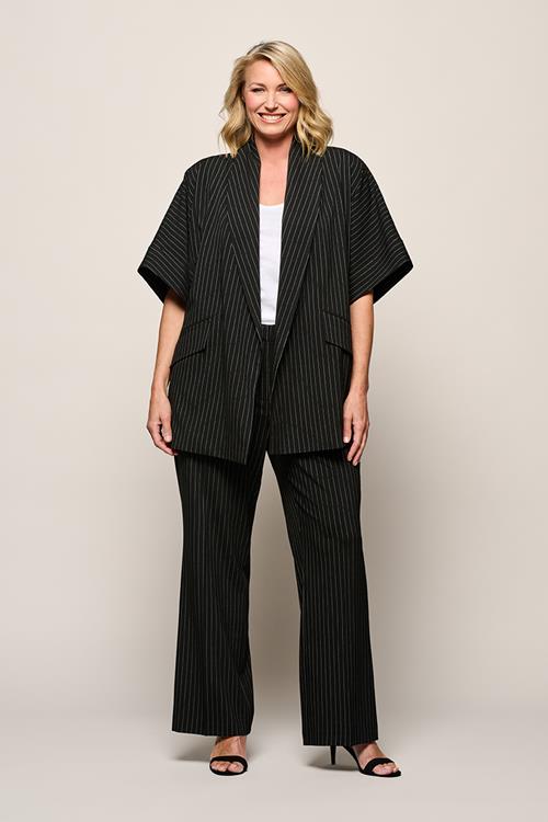 Zwart met witte krijtstreep kimono blazer met moderne pasvormDe Roseline blazer in zwart met witte krijtstreep is een krachtig statement piece met een eigentijdse uitstraling. Deze kimono blazer he…