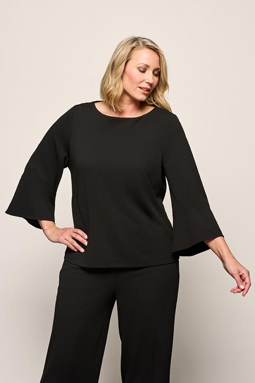Zwarte stretch top met elegante trompetmouwenDeSkyla top in zwart is een moderne, stijlvolle basic die door de uitgesproken tr…