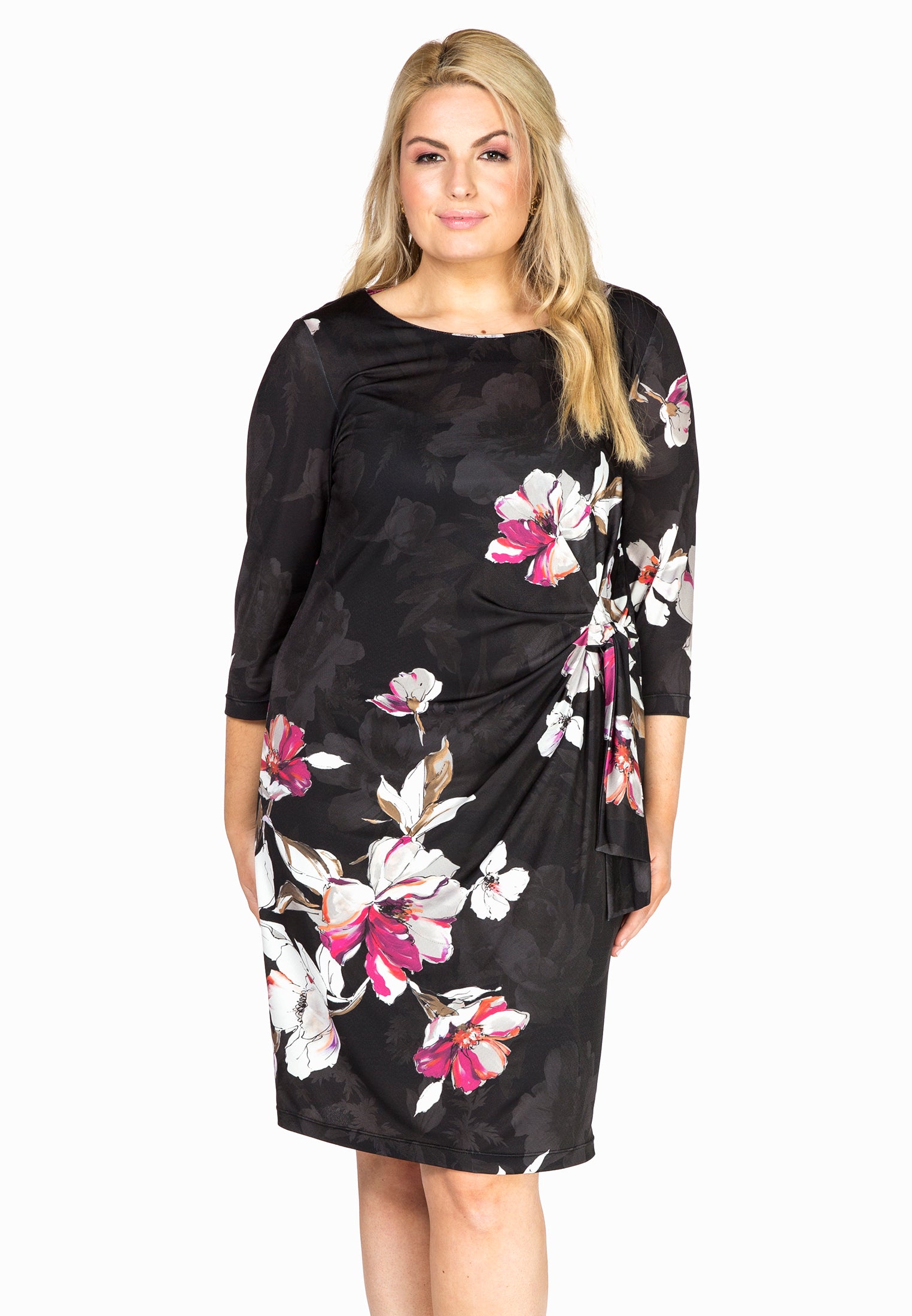 Deze jurk heeft een donkere, romantische bloemenprint. De voorkant heeft een geplooid effect en een gestrikt detail.