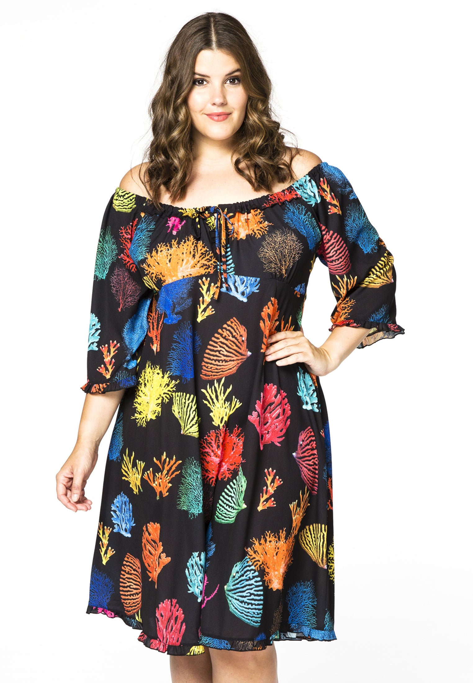 De oceaan was de inspiratie voor deze kleurrijke koraalprint. Deze lichtgewicht jurk heeft de populaire wijde halslijn, die ook off-shoulder gedragen kan worden.