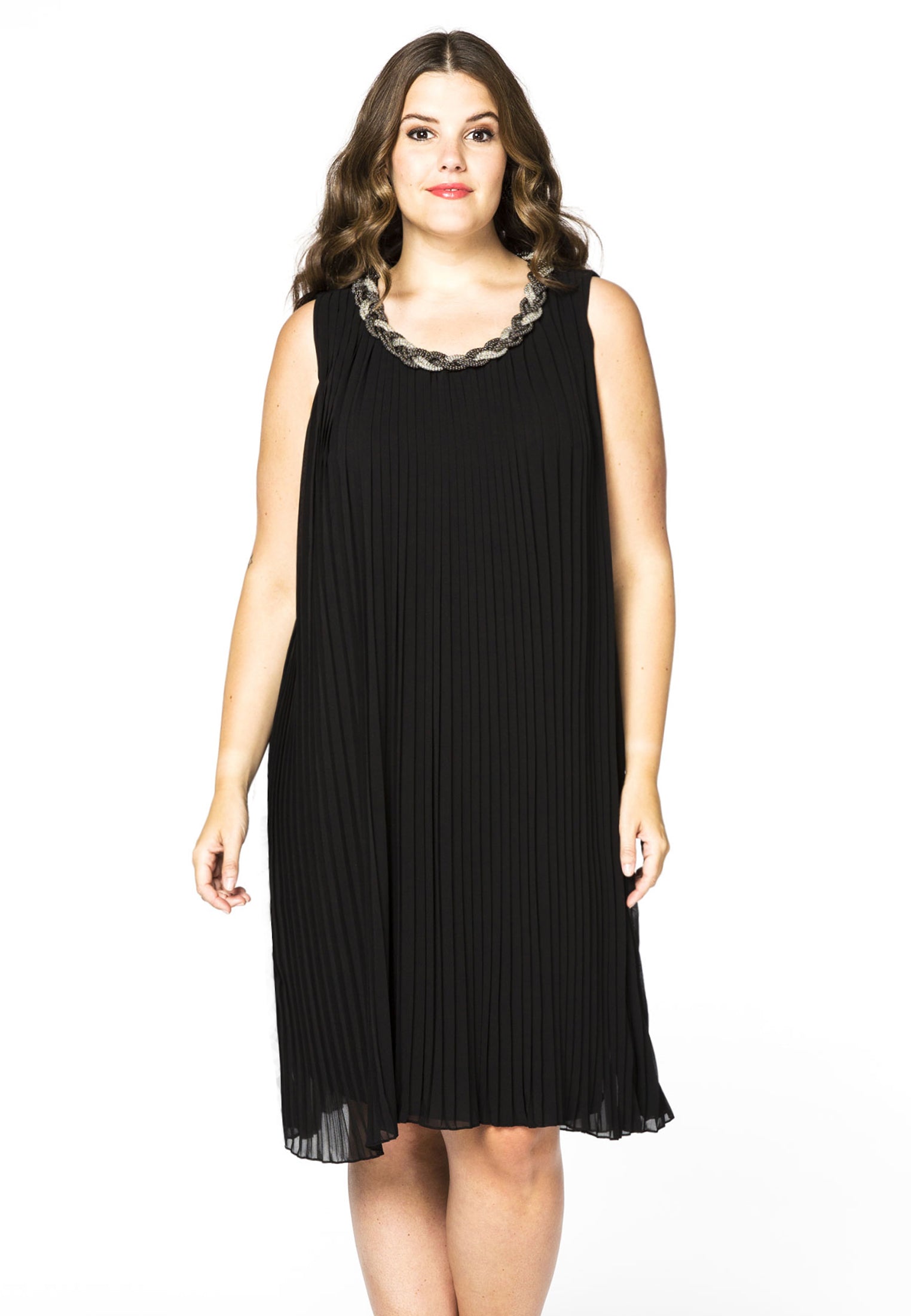 Super elegant is deze mouwloze plissé jurk, afgewerkt met een gevlochten versiering langs de hals. Deze voile jurk is perfect voor een chique diner of een glamorous feestje!