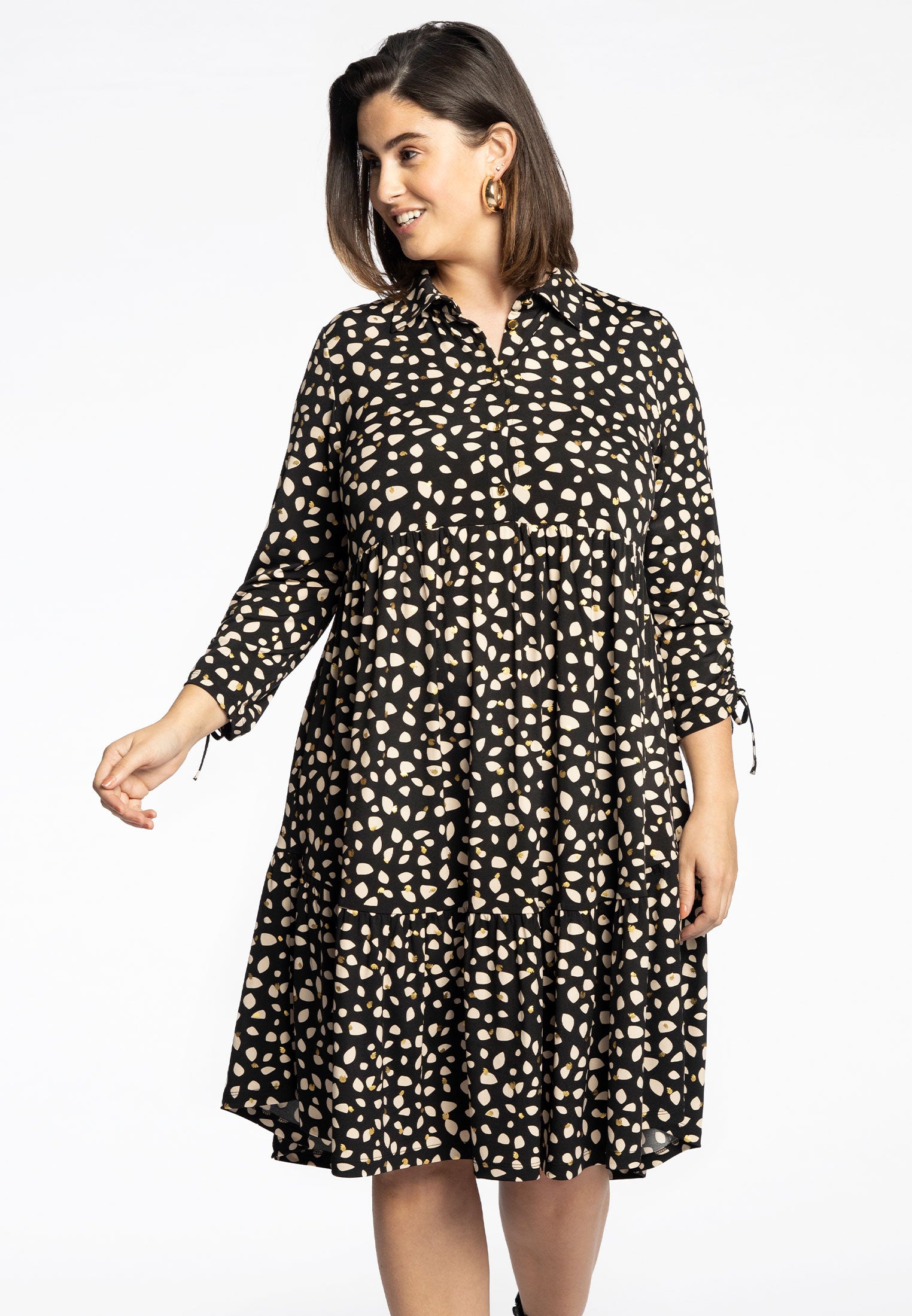 Jurk met kleine steentjes en gouden details. De jurk heeft een klassieke kraag met gouden knoopjes aan de voorkant. Aan de onderkant heeft de jurk ruches.