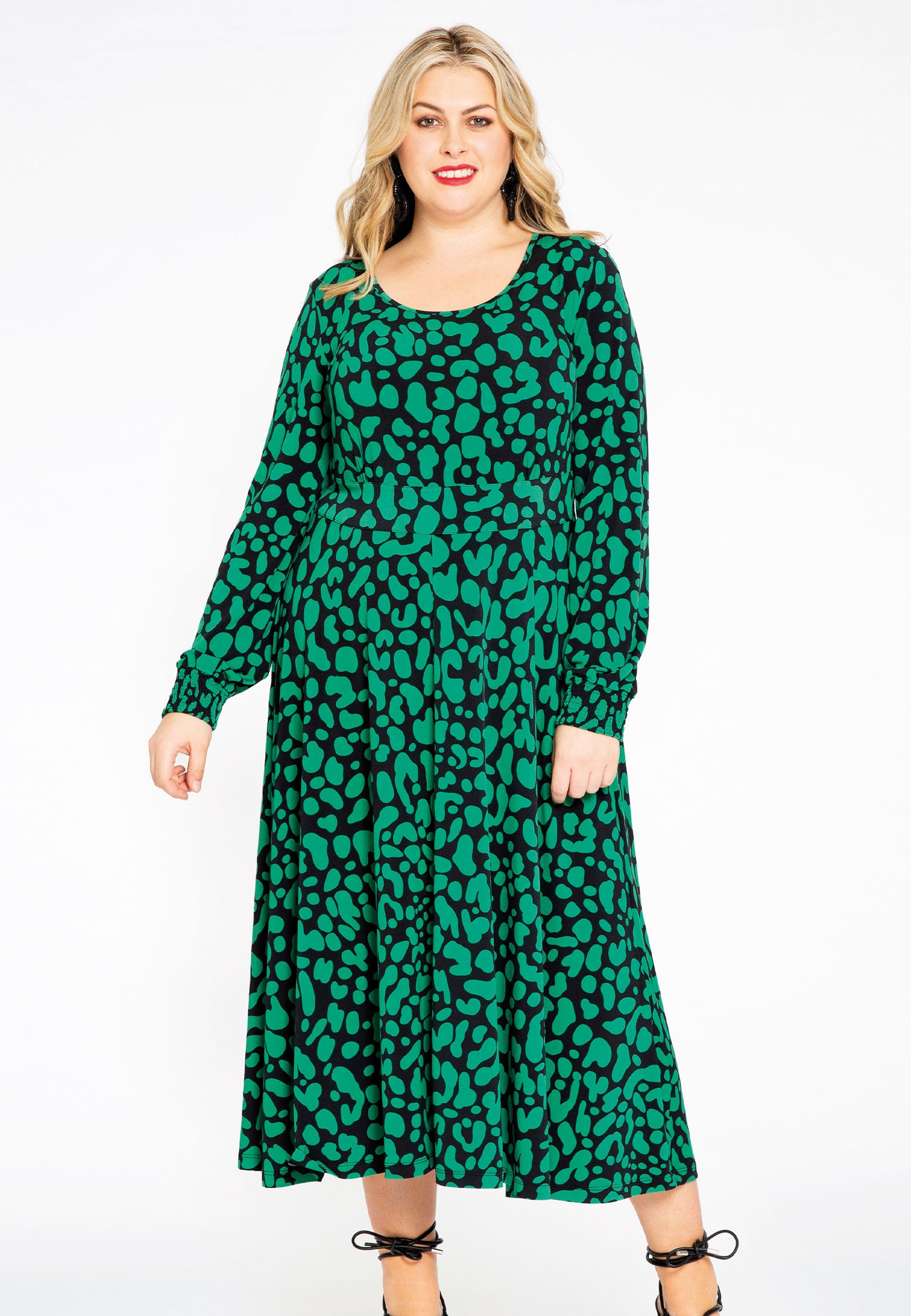 Dit seizoen kiezen we voor groen met het bubbly BELLA dessin. De dolce midi-jurk heeft een gesmokte achterzijde en manchetten, de taille valt aangesloten maar stretchy. Vanaf de taille valt de jurk wijd uit.
