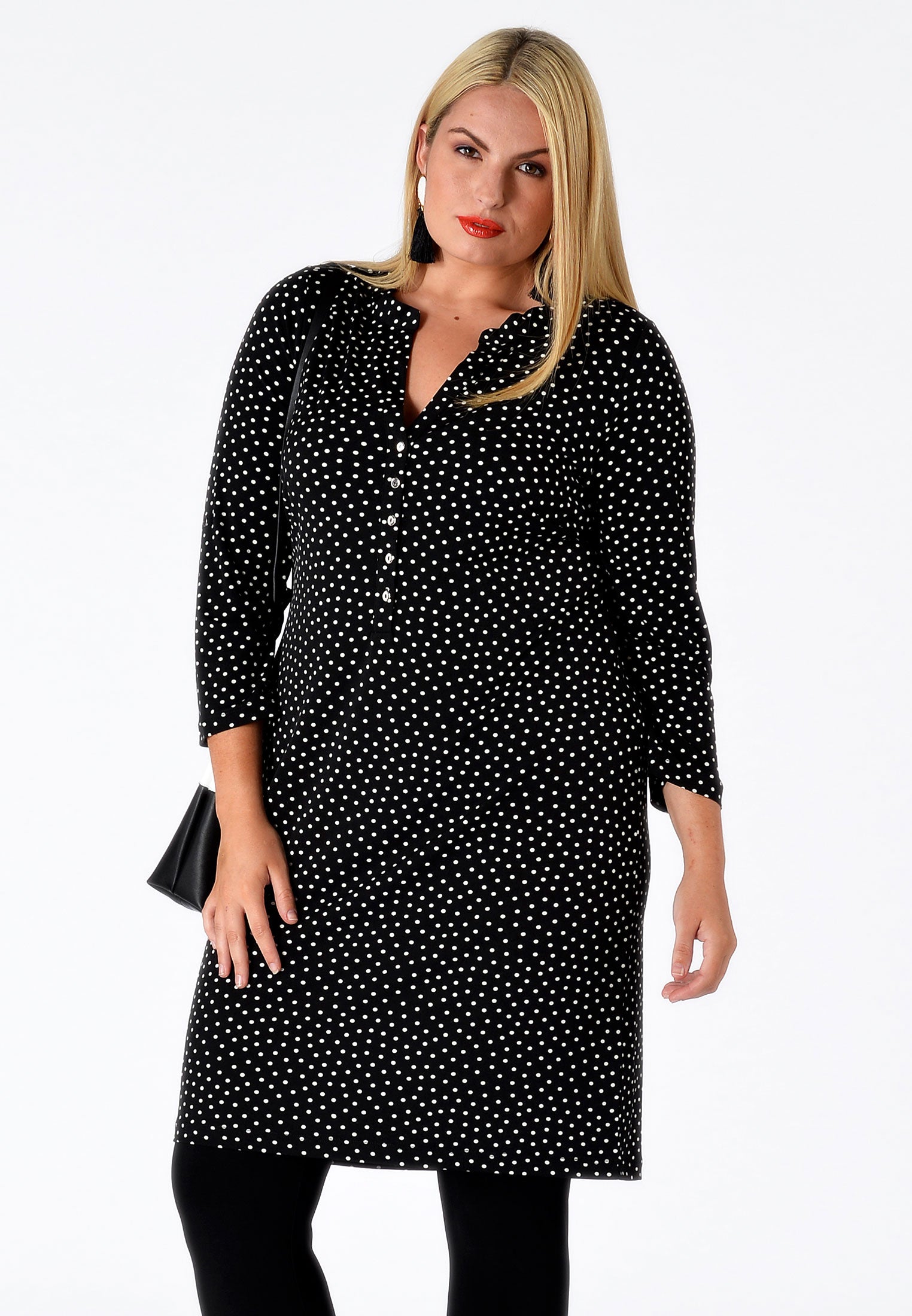 Een rechte tuniek met een mini polkadots voor een klassieke look. De tuniek heeft een v-hals met kleine knoopjes. Dit chique item is gemaakt van onze Dolce stof en kan mooi gecombineerd worden met een legging of skinny spijkerbroek.