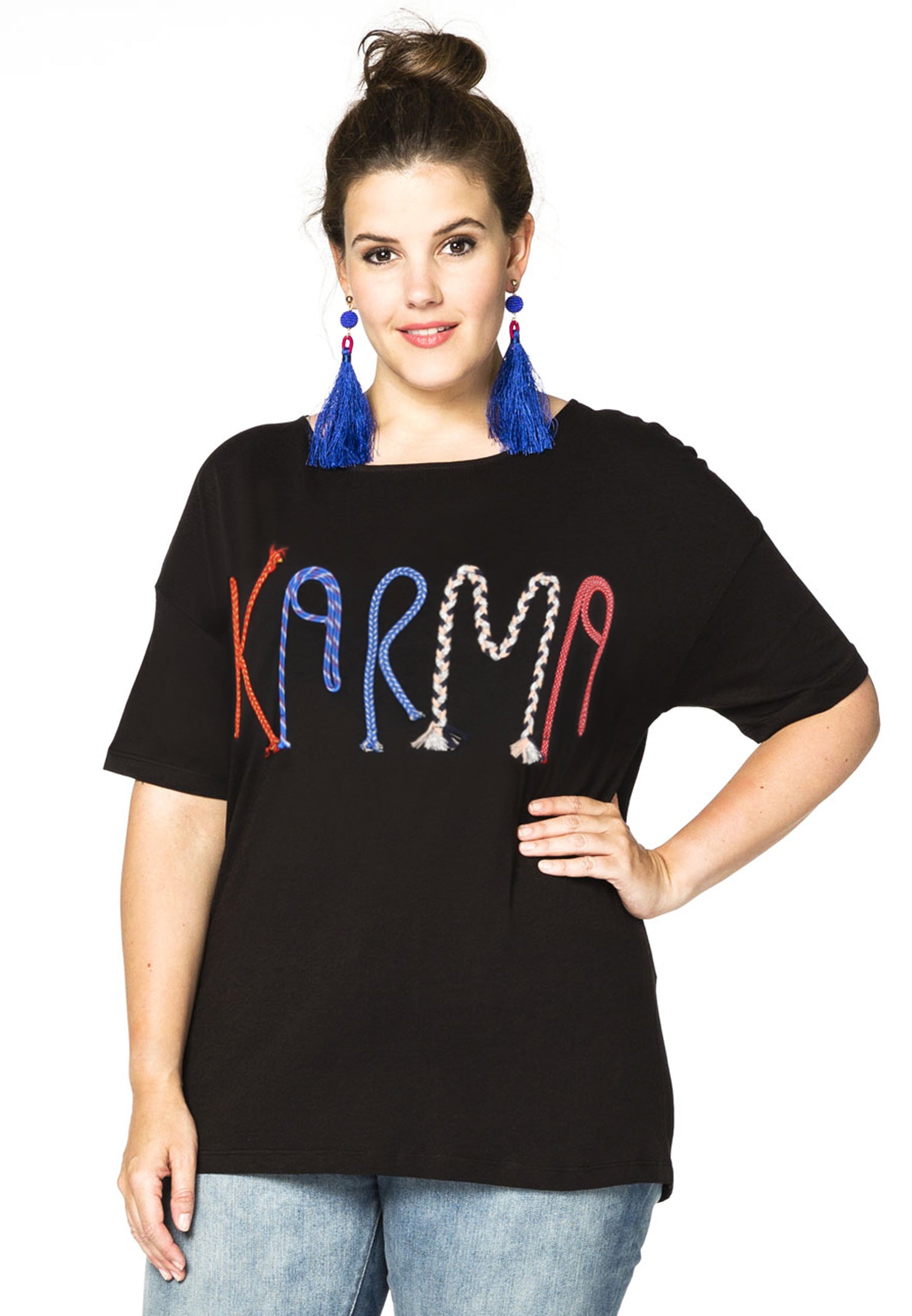 Een shirt met een boodschap is deze wijde top met korte mouwen. De letters zijn gemaakt van verschillende kleuren draad.