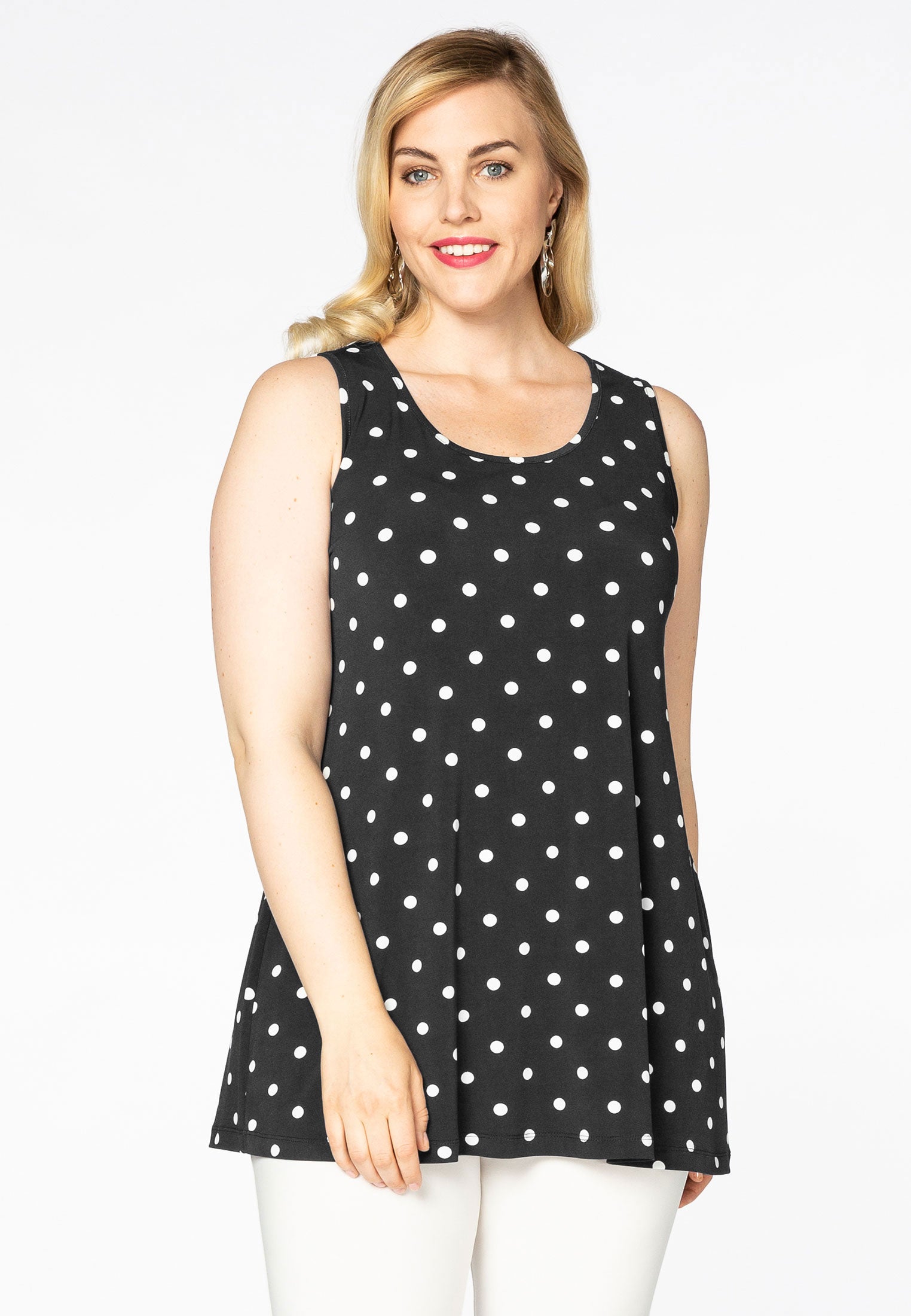 Deze singlet met onze flare pasvorm is versierd met polka-dots. Dit item is goed te combineren met vesten en jasjes.