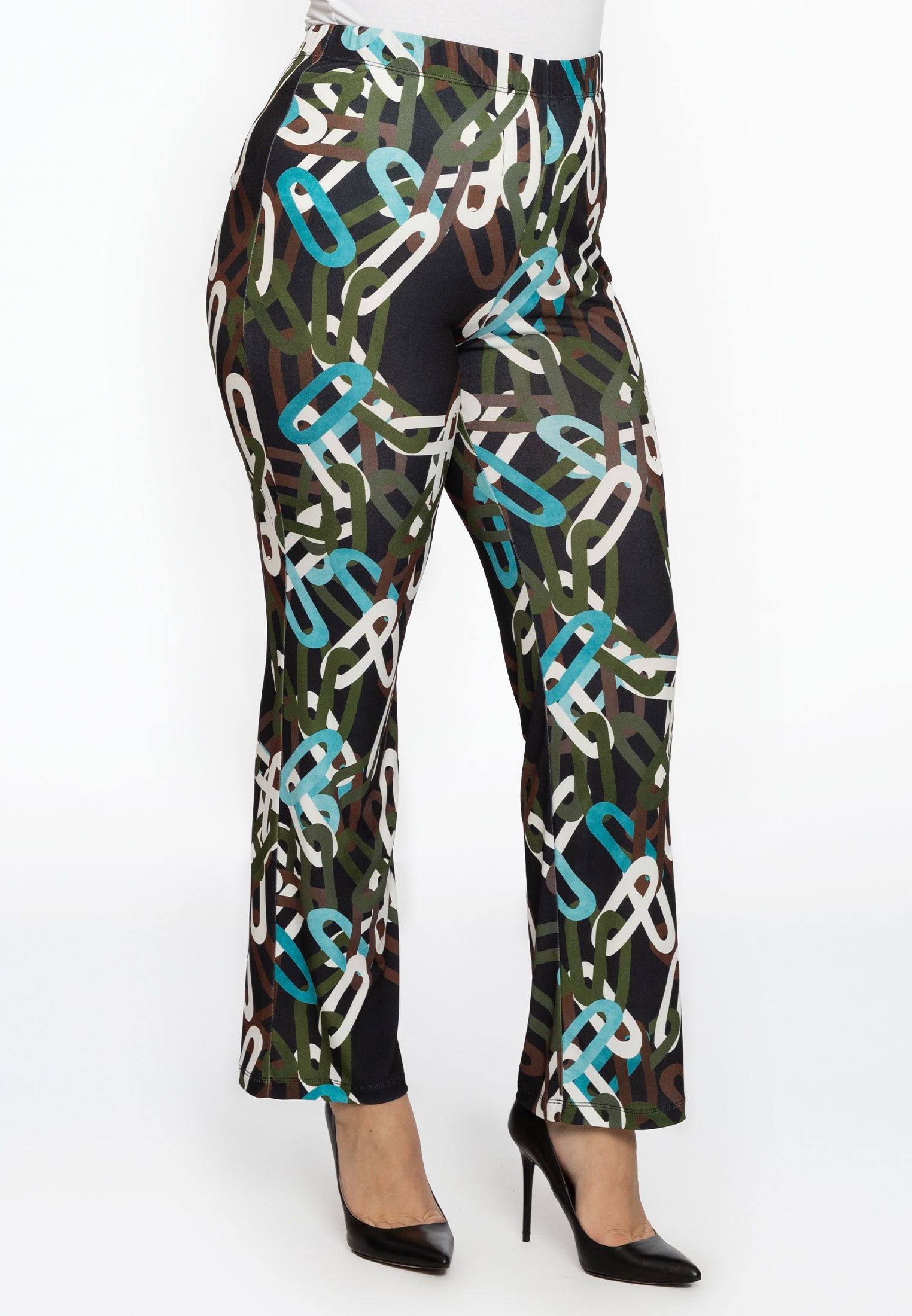 Geprint in een retro geïnspireerd ketting dessin, zal deze smalle broek je outfit meteen een kleurrijke lift geven! De tregging is gemaakt van het zachte dolce materiaal en heeft een elastische tailleband. Kies voor een classy outfit met enkellaarsjes of voor een meer casual look met sneakers.