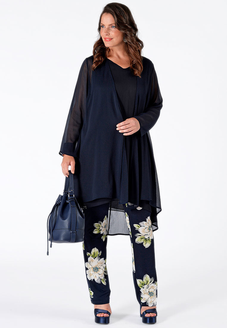 Een super chique, zomerse broek in een prachtige bloemenprint in gebroken wit met pasteltinten. De broek heeft een elastische tailleband. De broek kan gecombineerd worden met een donkerblauwe tuniek of een top in dezelfde print.
