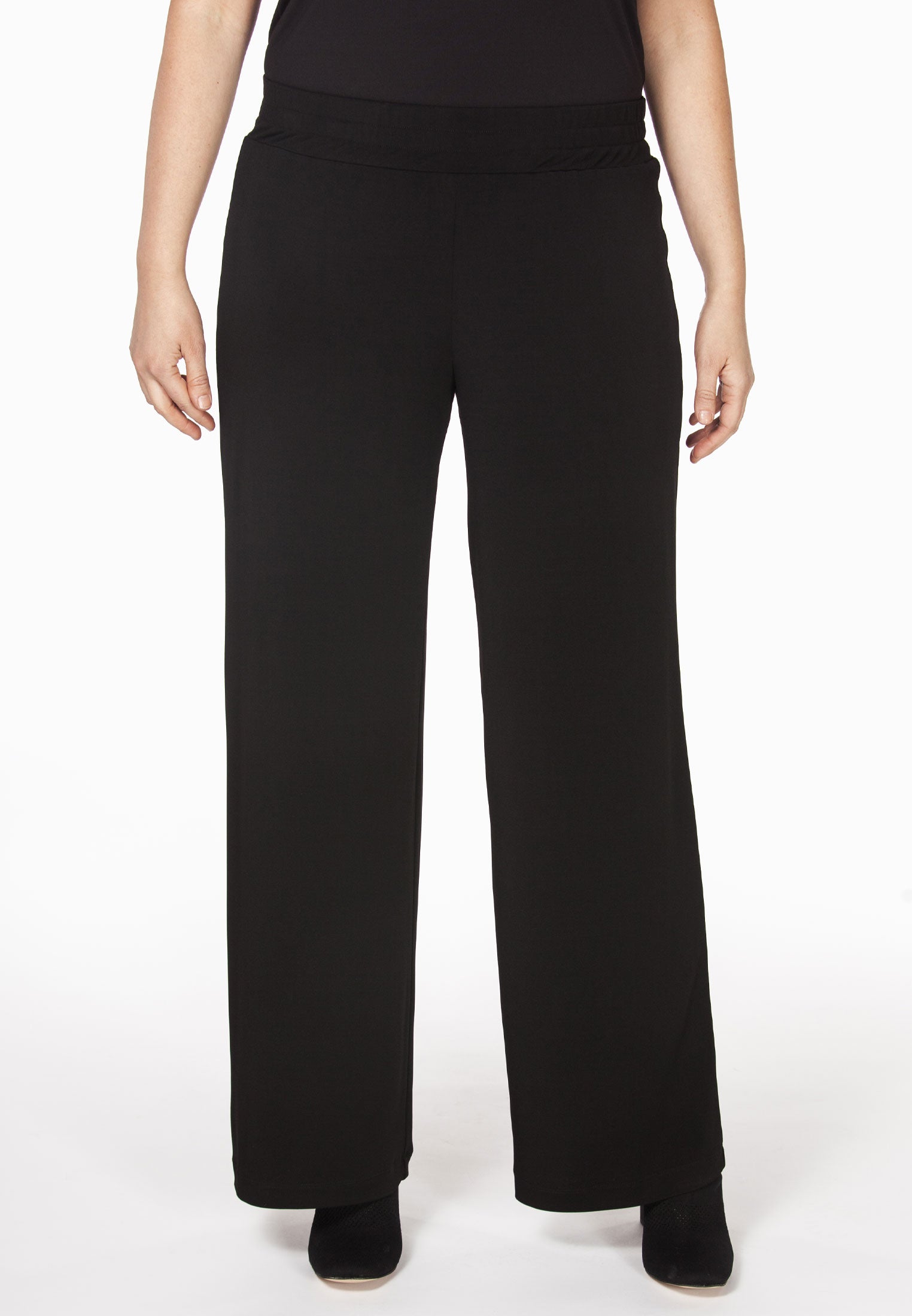 Een lange basic broek met rechte, wijde pijpen. De broek heeft een elastische tailleband en is gemaakt van onze comfortabele Dolce stof.