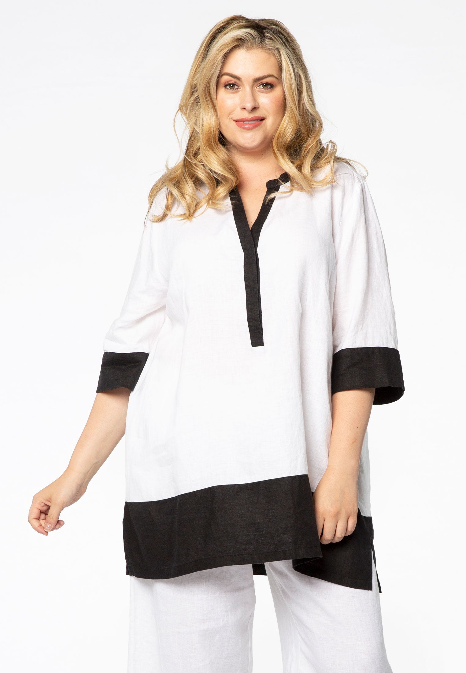 Deze zomerse colour-block tuniek is gemaakt van licht linnen. De tuniek heeft een opstaande kraag met bedekte drukknoopjes en een rechte pasvorm.
