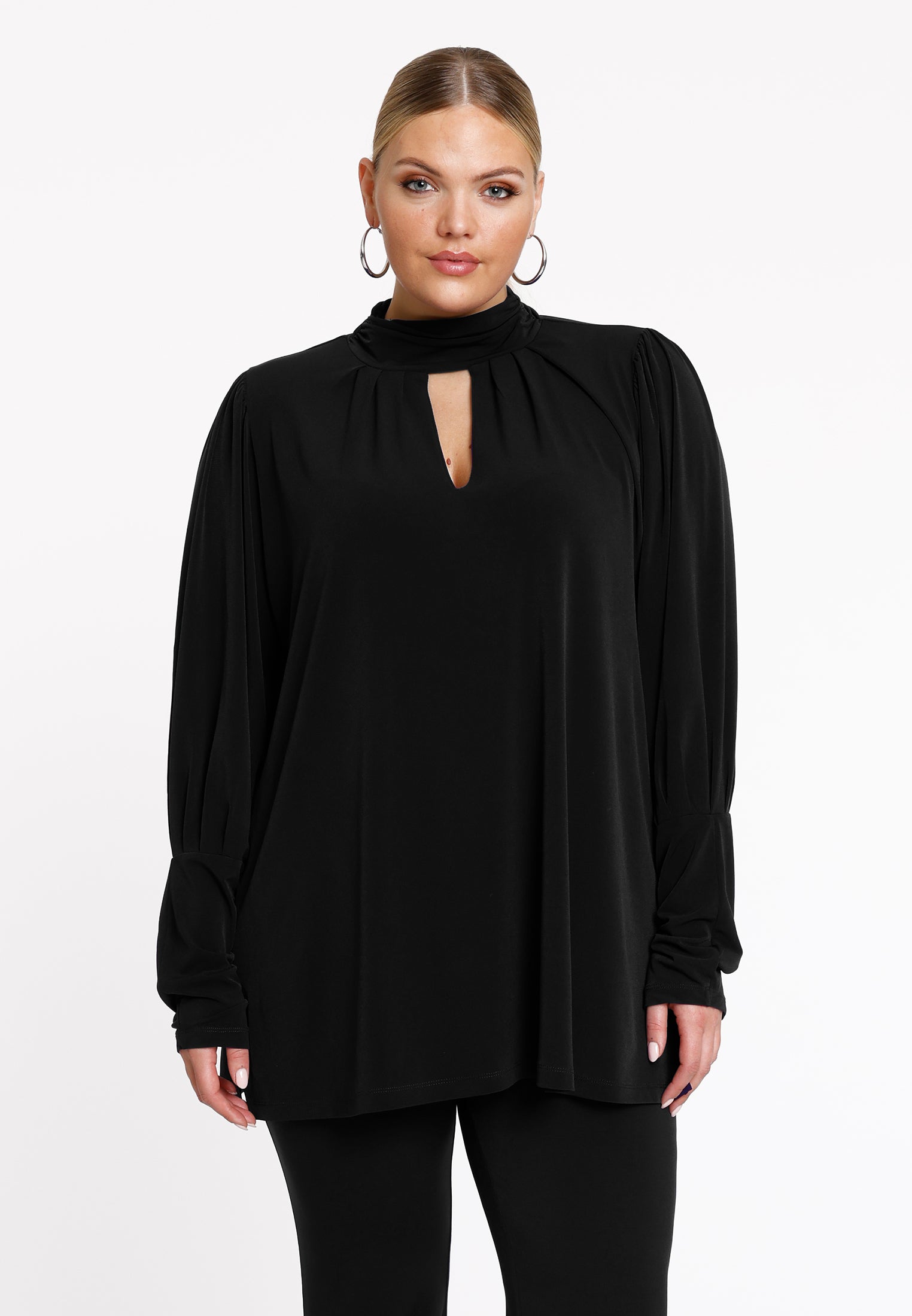 Deze tuniek is gemaakt van luxe Dolce-stof en voelt zacht, zijdeachtig aan en heeft een ontspannen pasvorm voor langdurig comfort. De hoge halslijn met keyhole-uitsparing voegt een modern tintje toe, terwijl de lange mouwen met zachte ruches de elegante drapering versterken. Perfect voor elke gelegenheid: combineer deze veelzijdige tuniek met een legging of een pantalon voor een stijlvolle, moeiteloze look.