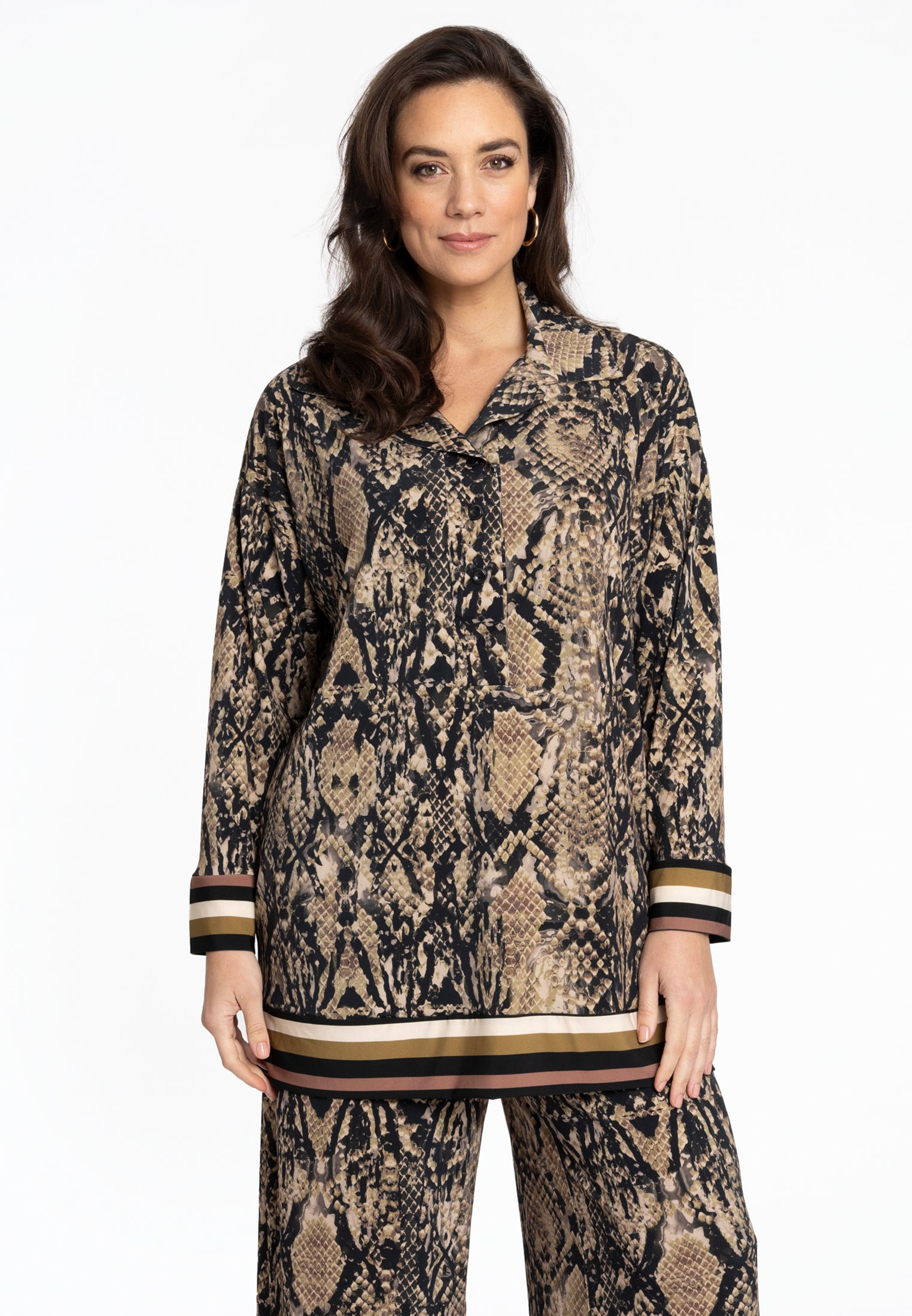 Omarm de stoere verfijning met onze prachtige tuniek met een opvallende slangenprint. Dit veelzijdige kledingstuk is ontworpen met lange mouwen en een chique kraag, zodat je overal een statement maakt. De zoom en mouwen van de tuniek worden geaccentueerd met stijlvolle streepdetails, wat een vleugje moderne elegantie toevoegt aan het exotische patroon.