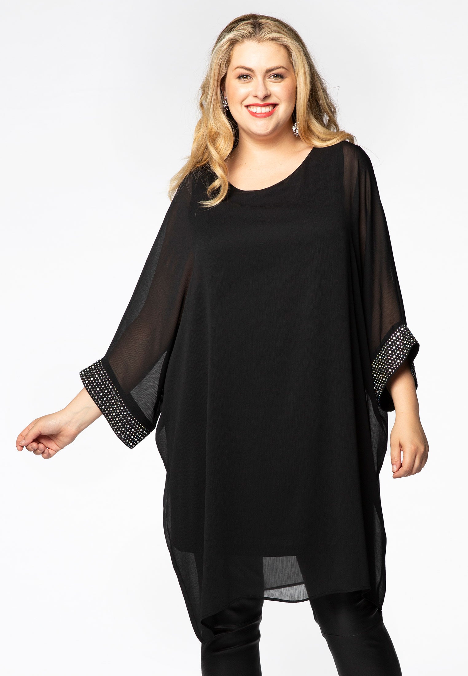 Super glamorous is deze dubbel gelaagde tuniek van voile. De mouwen zijn afgewerkt met glinsterende strass steentjes.