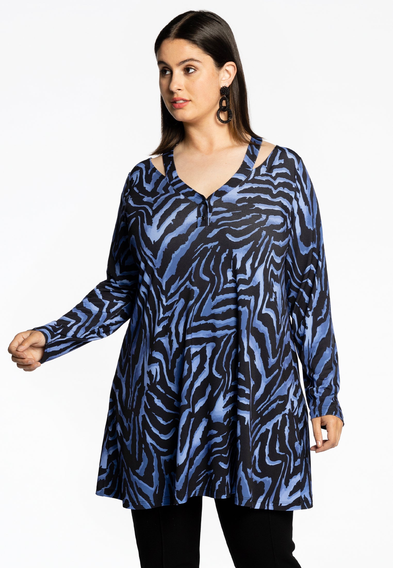 Als je graag net even iets anders wilt, dan is dit de ultieme tuniek om voor te vallen. De tuniek is voorzien van uitgesneden details welke een klein stukje van je schouders onthullen. De v-hals sluit met glinsterende diamanten knoopjes. De tuniek in een zebraprint is vervaardigd van het dolce materiaal en heeft de wide bottom pasvorm. Een ware eye-catcher om aan je favorieten toe te voegen.