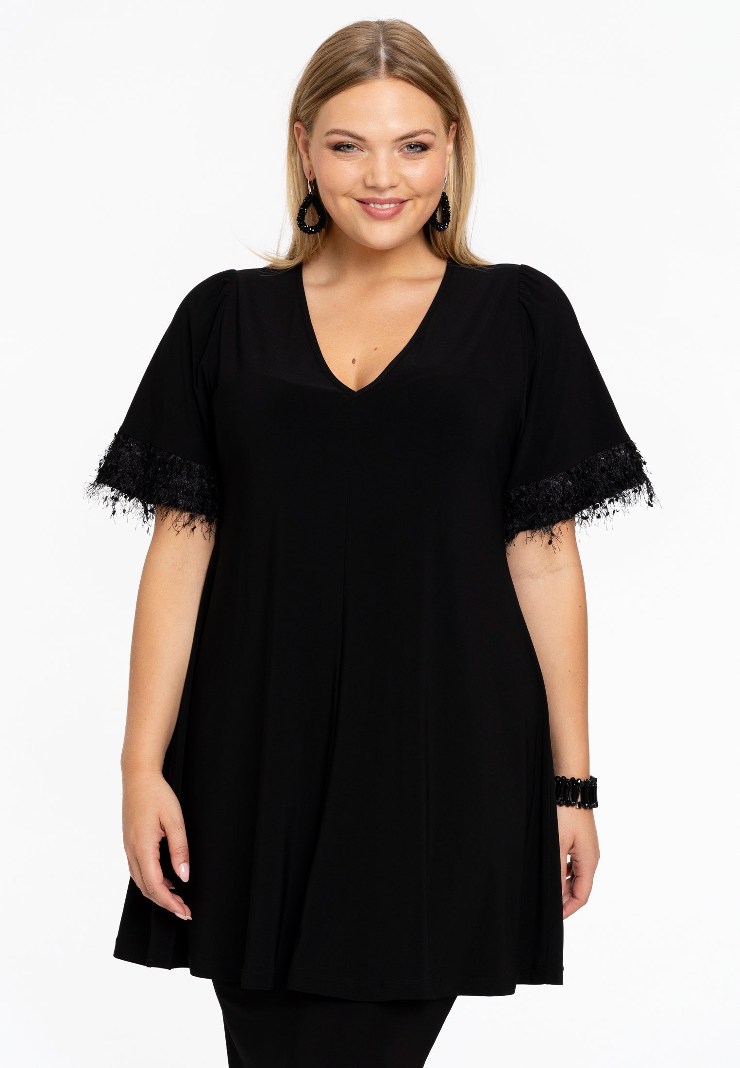 Zei er iemand feestje? Deze tuniek is de perfecte aanvulling op je feestkleding. Het heeft een wijde pasvorm aan de onderkant, een v-halslijn en korte mouwen, gedetailleerd met kwastjes en glitters. Gemaakt van het bekende Dolce materiaal.