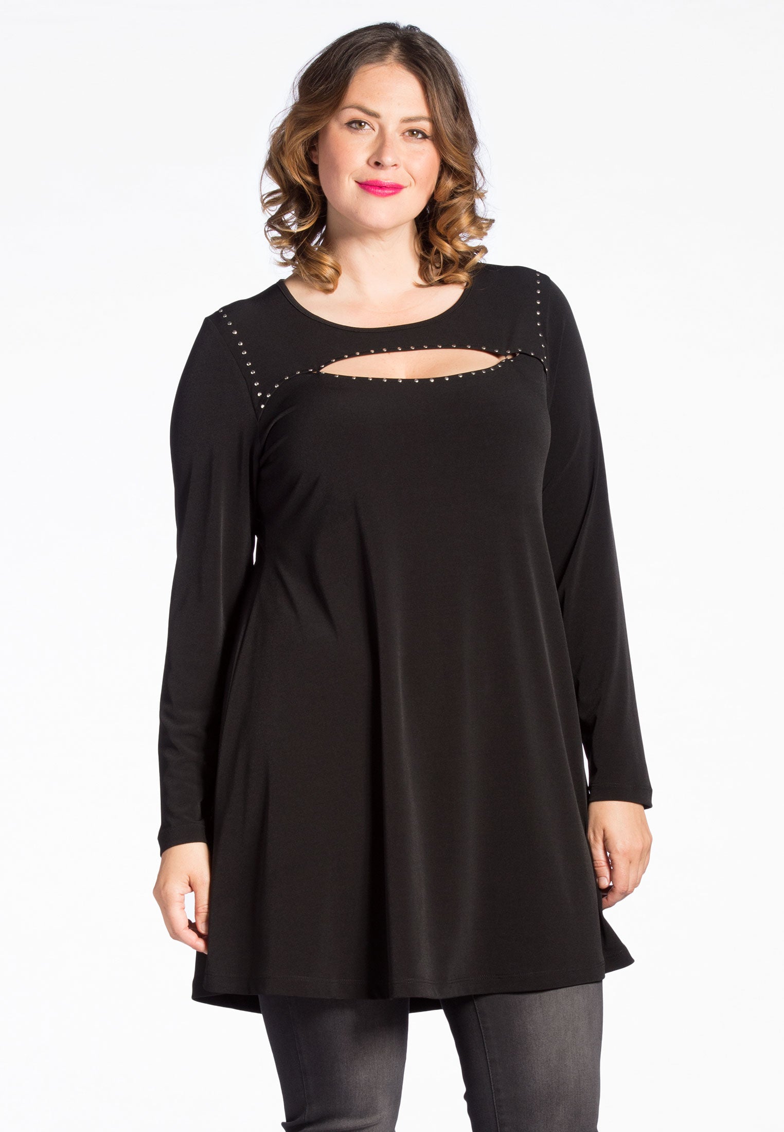 Er glamorous uitzien wordt heel simpel met deze tuniek, met een cut-out halslijn die een mooi stukje huid laat zien. De halslijn is versierd met zilveren studs. De dolce tuniek heeft onze wide bottom pasvorm.