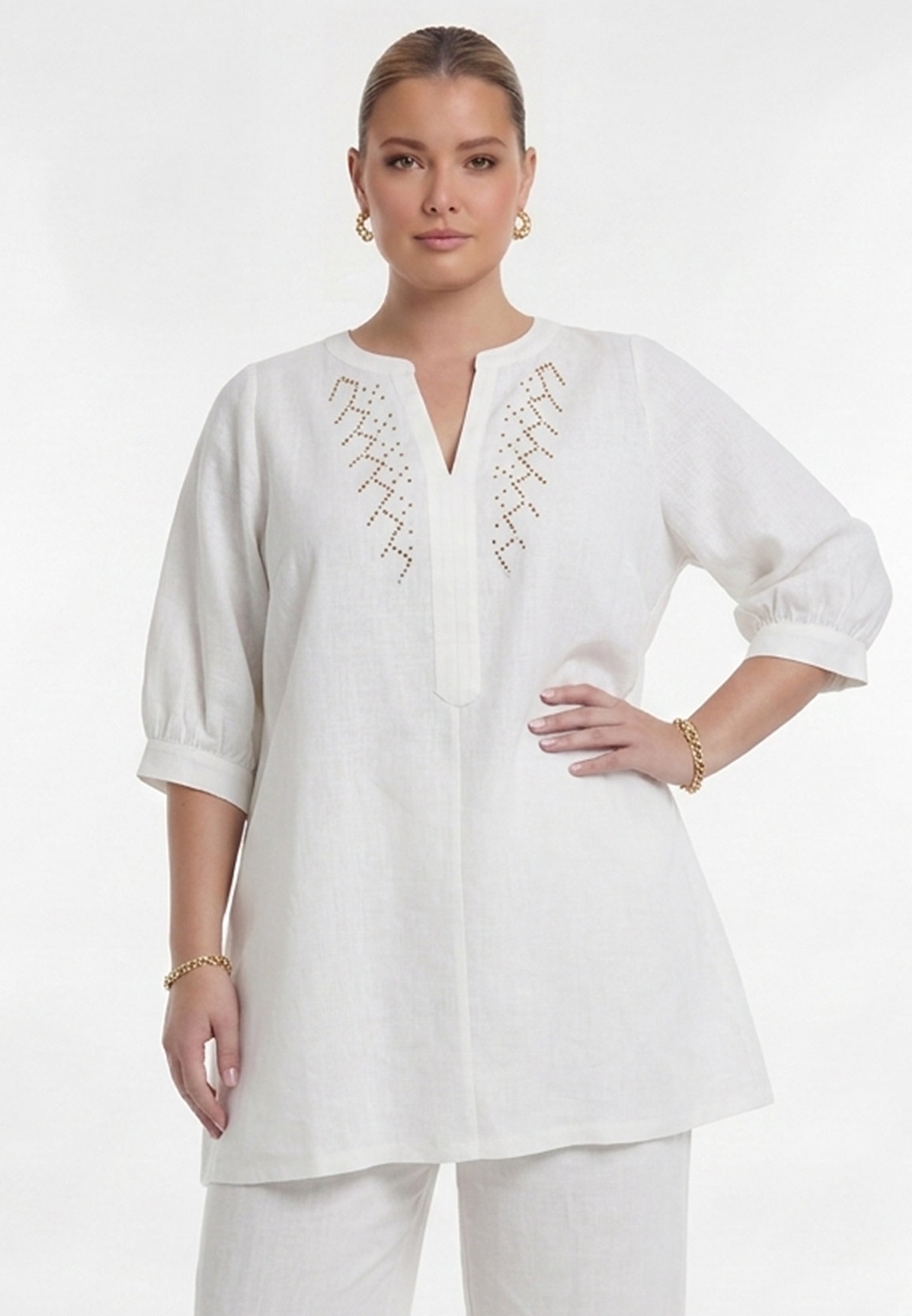 Het wordt tijd om een tijdloos linnen item toe te voegen aan je zomergarderobe! Deze tuniek is verrijkt met subtiele steentjes langs de halslijn. Voorzien van een V-hals, 3/4 mouwen en een relaxte pasvorm. Linnen staat bekend om zijn verkoelende eigenschappen en clean uitstraling, ideaal voor zonnige dagen. Combineer met de bijpassende linnen broek voor een complete co-ord look.