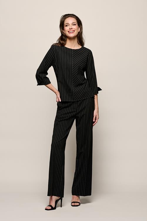 Zwart-witte krijtstreep top met diagonaal detailDe Zion top in zwart-wit is een elegante en veelzijdige blouse die een moderne twist geeft aan een klassieke stijl. Deze top heeft een ronde hals en …